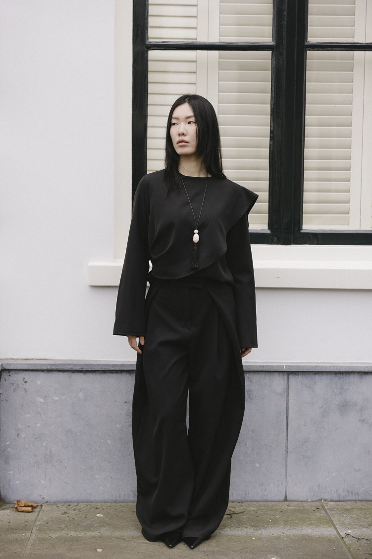 Designed with a fluid structure and wide-leg silhouette, these trousers create a balanced and refined look. The front pleat detail adds shape and structure, while the minimal design allows for effortless styling with different pieces.