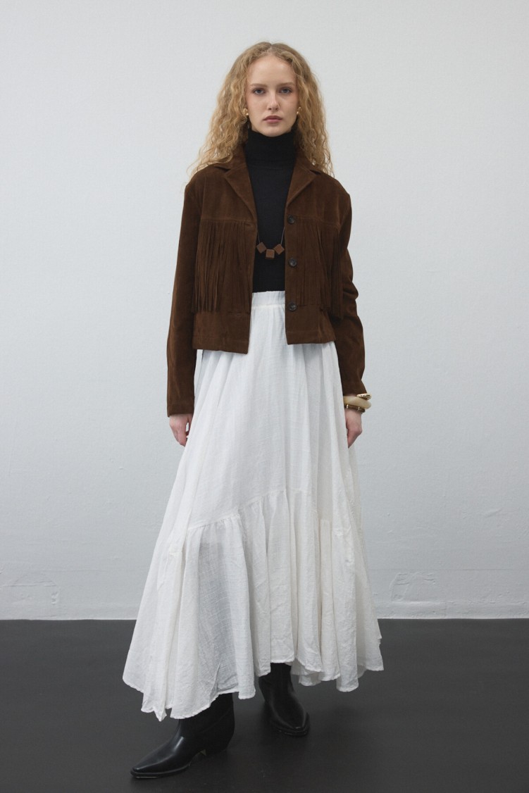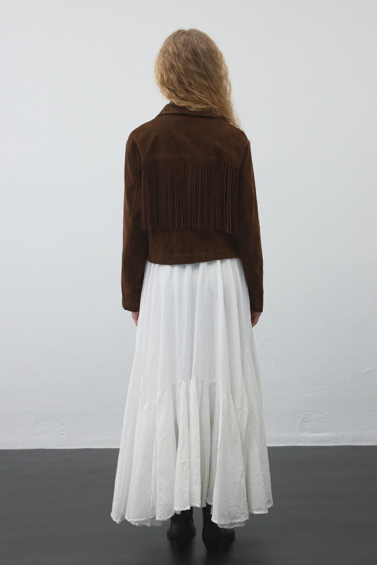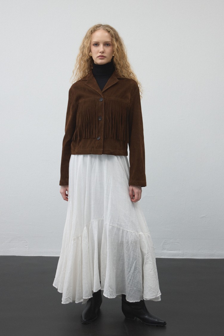 Notify me when its in stockCrafted from soft faux suede, this jacket offers a warm and stylish look in natural brown tones — perfect for seasonal transitions. The fringe details on the front and back add fluidity with movement, creating a modern western-inspired style.