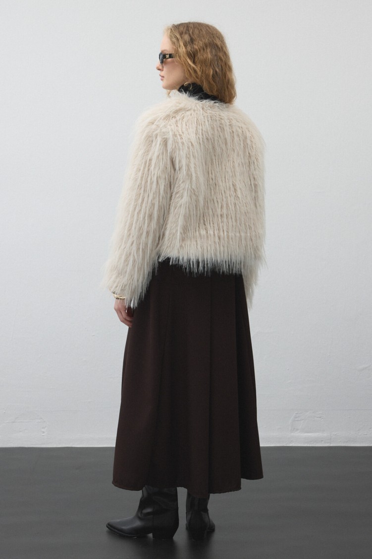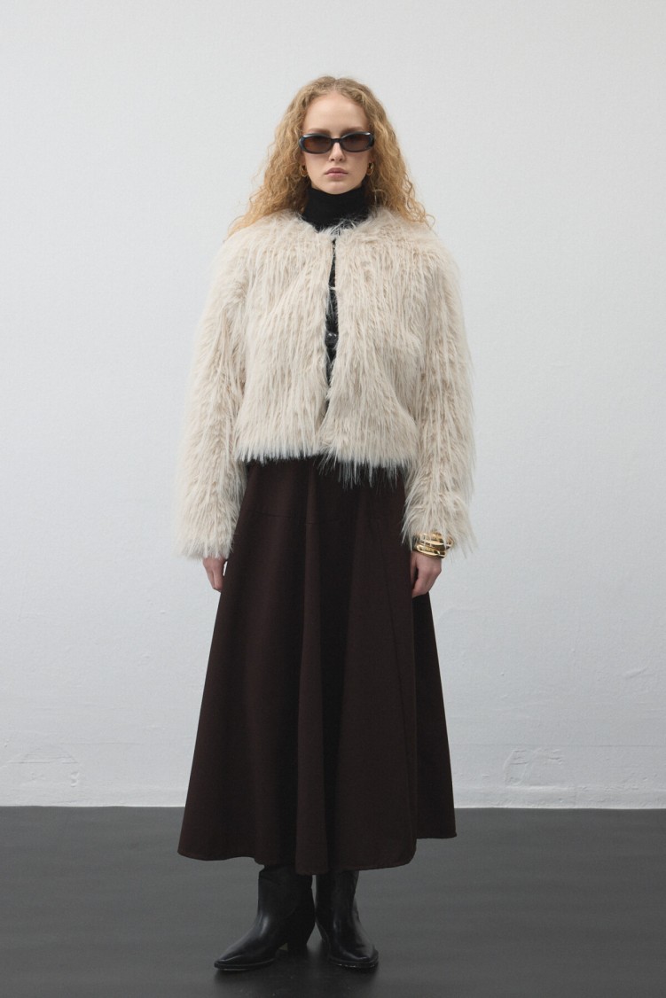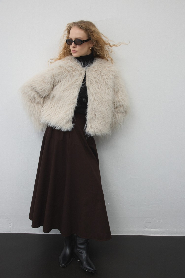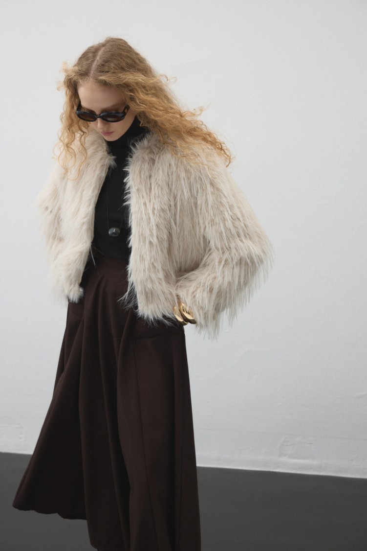 With its soft faux fur texture, this piece offers warmth and comfort, while its structured form brings an elegant stance to the winter season.