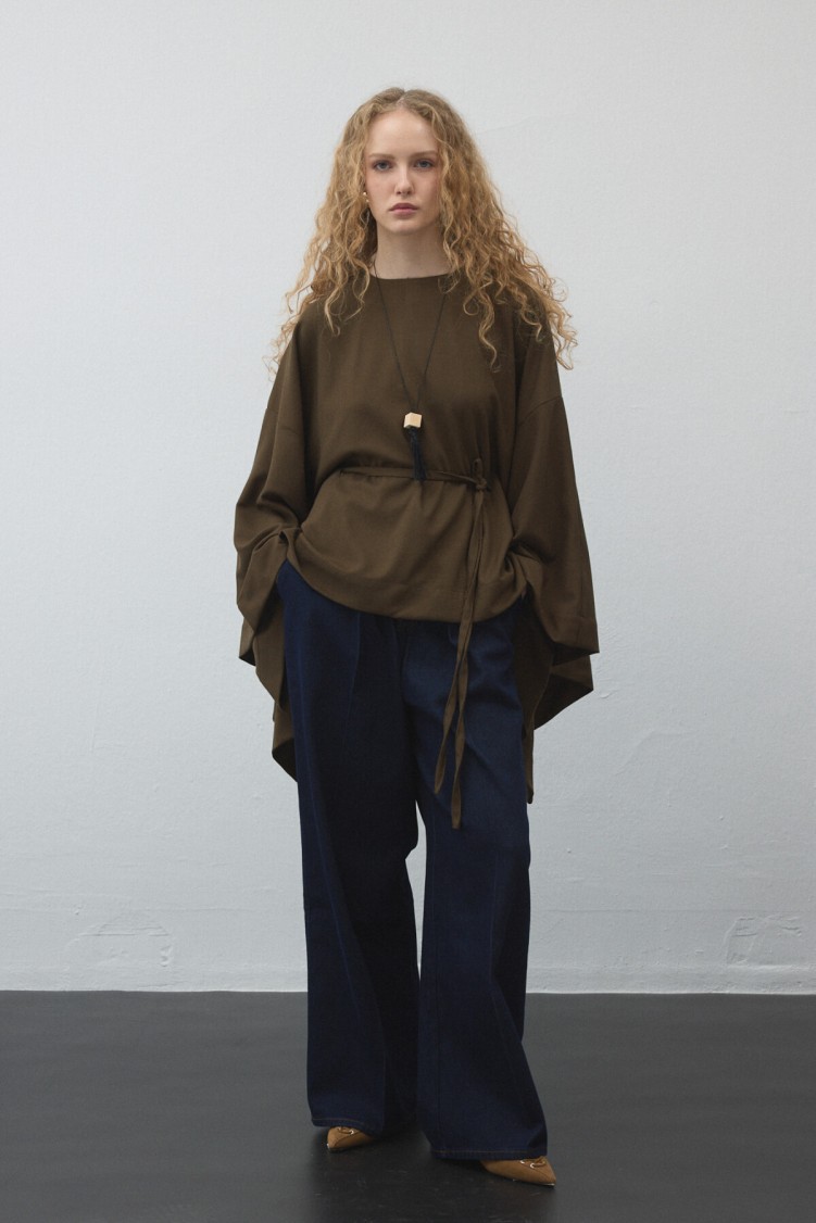 With its fluid cape form and waist belt detail, this piece gains a light flow with movement, while the belt accent creates a modern and feminine balance — an ideal choice for a powerful look.