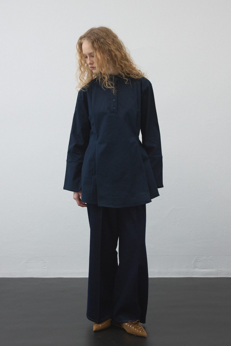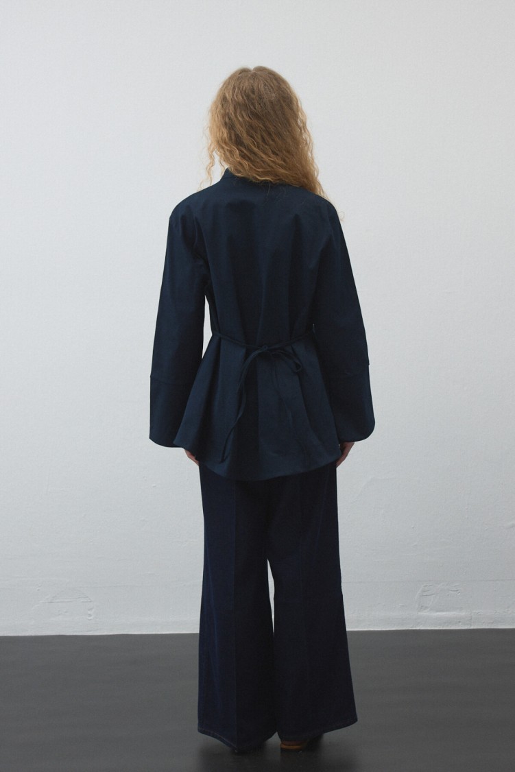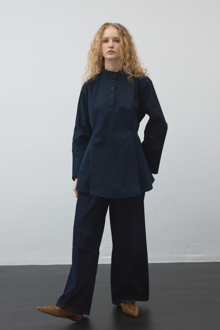 Gelince Haber VerYapılandırılmış gabardin dokusu ve volan detayıyla hareket kazanan bu tunik, sabit kemeriyle bel hattını zarifçe vurgular. Akış ve form dengesini bir arada sunan tasarımıyla günlük stilin modern ve güçlü tamamlayıcısı.