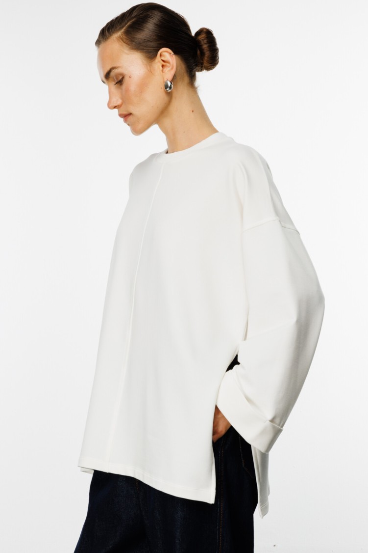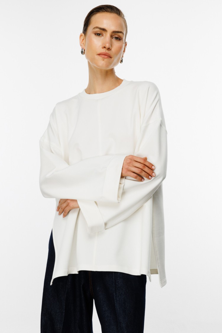 Yırtmaçlı oversize sweatshirt, hafif yapısıyla gün boyu rahat hissetmenizi sağlarken, sade tasarımıyla her ortamda kolayca kombinlenebilir.
